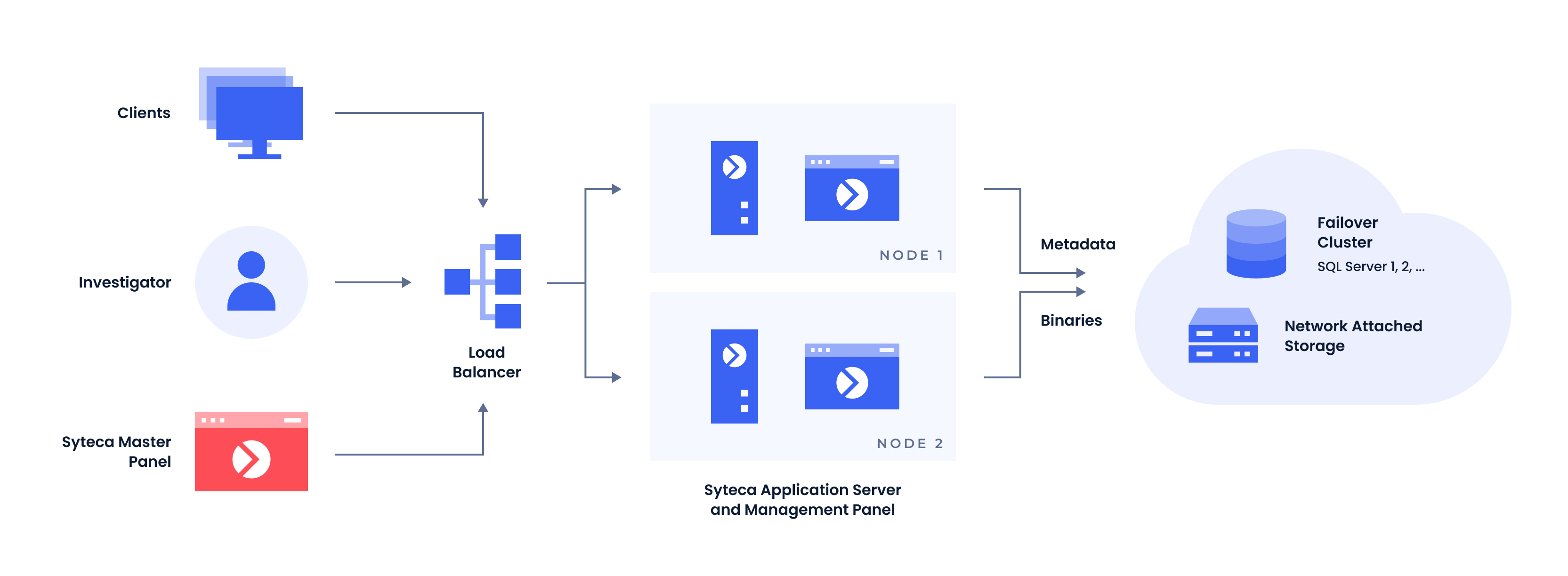 Load balancing is used to distribute the load, resulting from the processing (of large numbers of) Syteca Clients simultaneously, in an optimized way over multiple different Syteca Application Servers in a cluster.