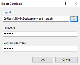 2. In the Export Certificate window, define a location and password for the certificate, and then click OK.