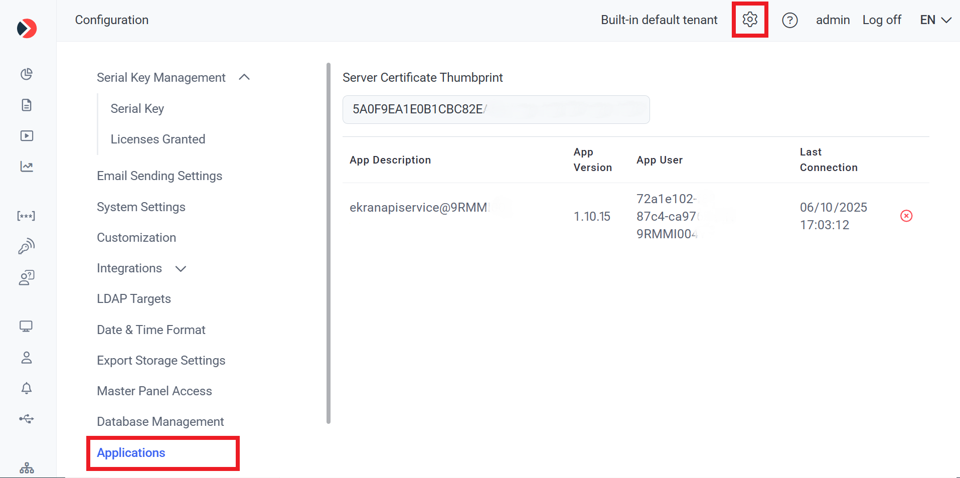 Having installed the Data Connector application, you will see it displayed in the Management Tool (click the Configuration () button (at the top), and select the Applications tab).