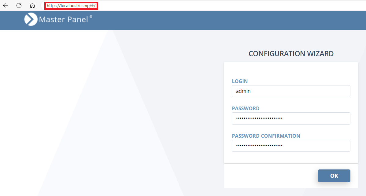 1. On the computer where you installed the Master Panel, open it by entering the following URL into your browser address bar: https://localhost/esmp/#/