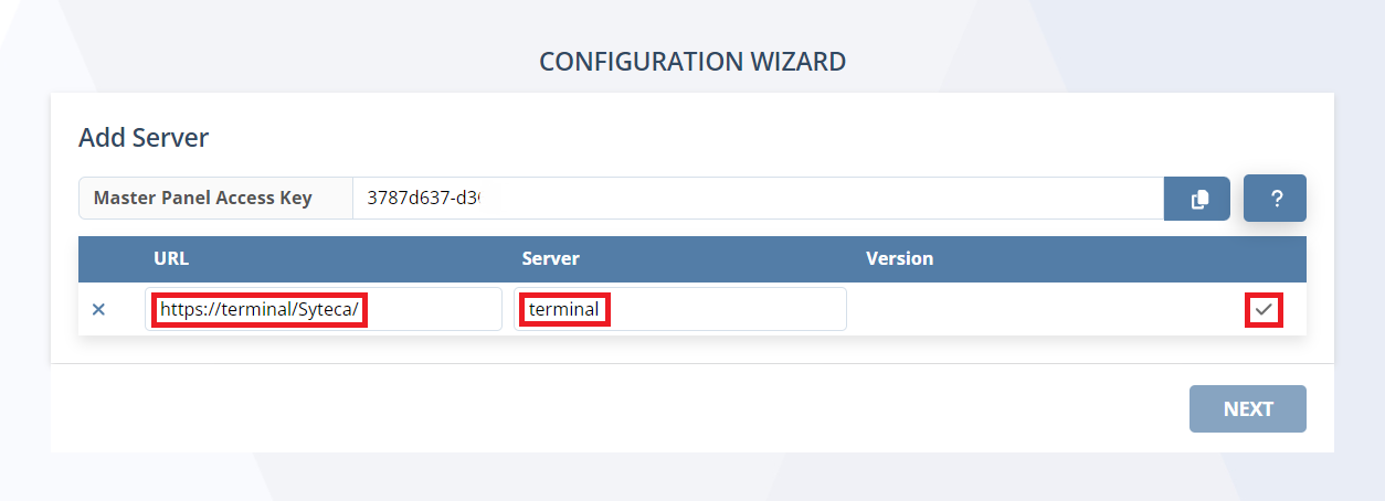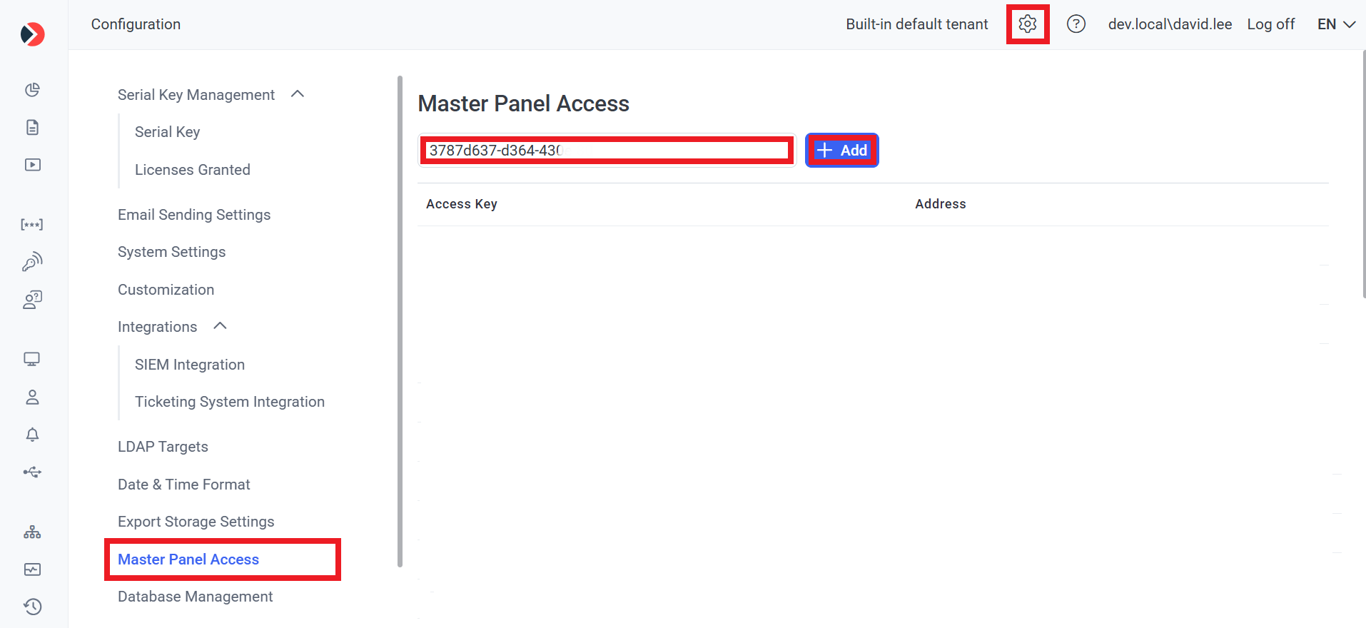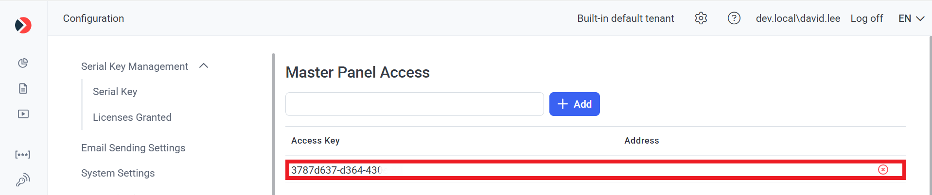 • On the Configuration page that opens, select the Master Panel Access tab, and paste the Access Key that you copied from the Master Panel into the empty field, and then click the Add button (to the right of it).