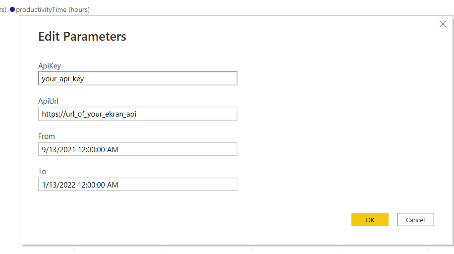 8. If required, change the values in the From and To fields (they are only used for the User Productivity dataset).