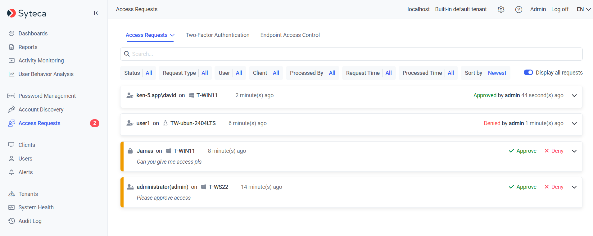 The Display all requests toggle switch slider (in the top right) can be used to also view all old requests i.e. requests that are no longer pending (including Approved, Denied, and Expired requests).