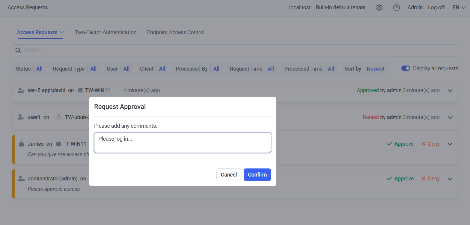 The Approver can process a request by clicking the Approve or Deny buttons (on the right of each request), and in the popup window that opens, and optionally enter a text message, and then click Confirm.