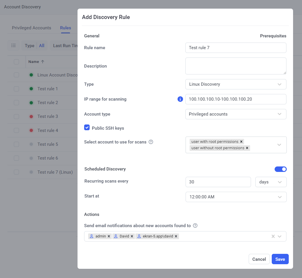 - one or multiple secrets (in the drop-down list of Unix account (SSH) secrets with private SSH keys displayed) [for the Linux Discovery rule type only].