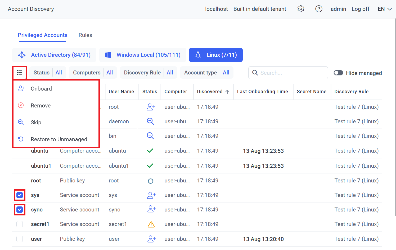 New and modified Active Directory, Windows local, and Linux accounts can then be discovered on the network automatically by running the rules (to perform network scans), after which these accounts can selectively be onboarded into new Password Management account secrets, either individually or by using Bulk Action to onboard/manage multiple accounts simultaneously, and without needing to know their credentials.