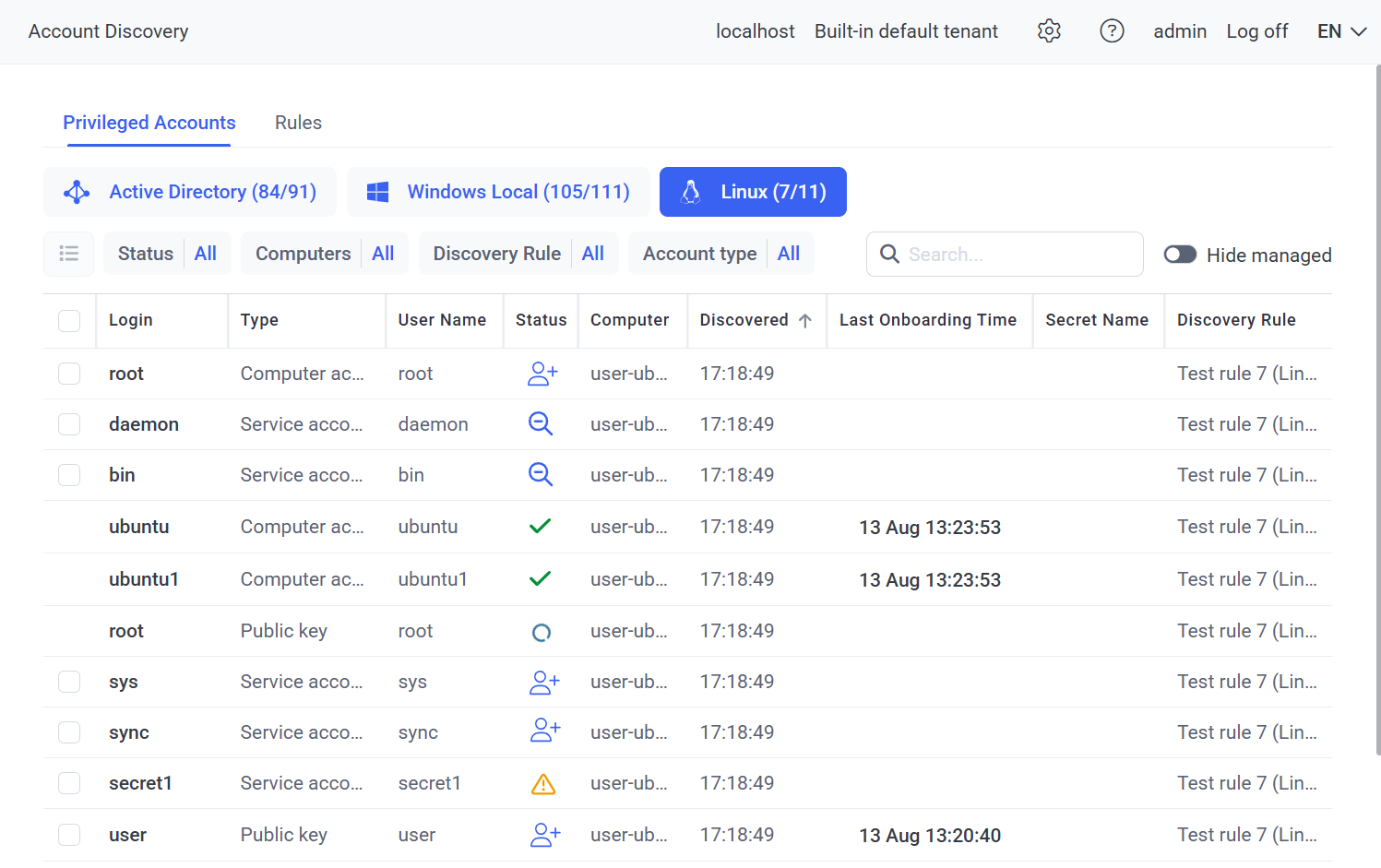 • NOT AVAILABLE IN SAAS Linux Discovery rules (for privileged Linux accounts, and (optionally) also service and application accounts, and accounts with public SSH keys).
