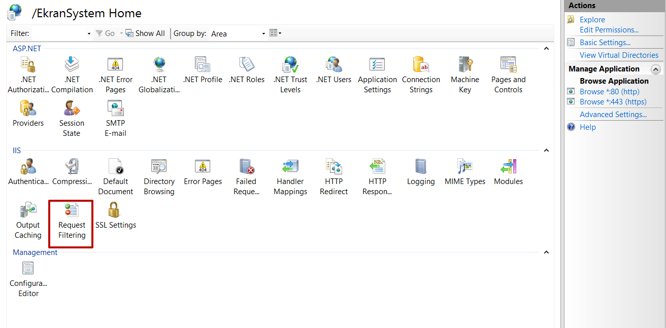 1. In Internet Information Services (IIS) Manager, open the <hostname> > Sites > Default Web Site > Syteca section.