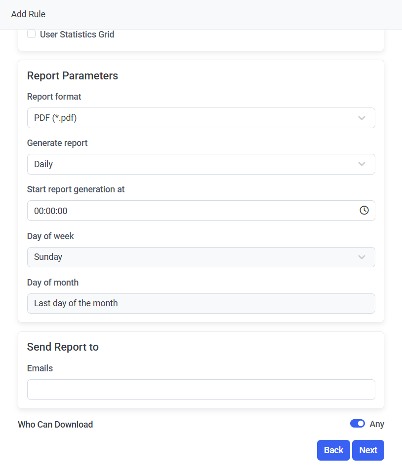 - If the Monthly option is selected in the Generate report drop-down list, select the day of the month (or Last day of the month) on which the reports will be generated in the Day of Month drop-down list.