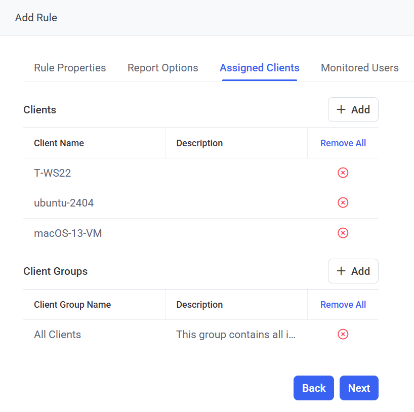 6. Click the Next button in the bottom right of the page, and on the Assigned Clients tab that opens, select the Clients and Client groups to which the rule will be applied by using the Add Clients and Add Client Groups buttons in the respective sections, and then click Next.