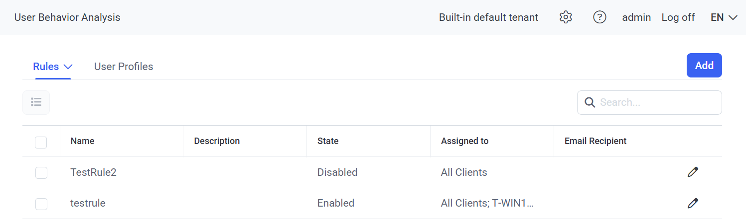 3. On the Rules tab of the User Behavior Analysis page that opens, click the Add button (in the top right of the page).