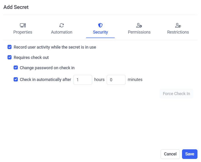 • Requires check out: Select this checkbox to enable the Password Checkout functionality, so that only one user can check out the secret's password (i.e. can connect to the account that the secret connects to) at any given time.