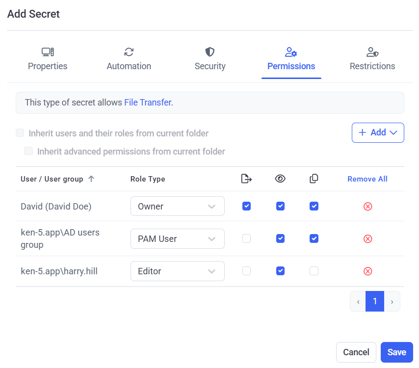 NOTE: Alternatively, the users / user groups who will be able to use the secret, along with their permissions, can be inherited from the parent folder if configured as required in this folder (except from the "All secrets" folder) by selecting the "Inherit users and their roles from current folder" checkbox (to inherit the users / user groups along with their Role Type permissions from the current folder) and the "Inherit advanced permissions from current folder" checkbox (to inherit the "View Password" and "File Transfer" advanced permissions for the users / user groups from the current folder).