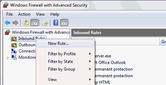 3. In the Windows Firewall with Advanced Security window, right-click Inbound Rules and select New rule... in the context menu that opens.