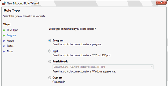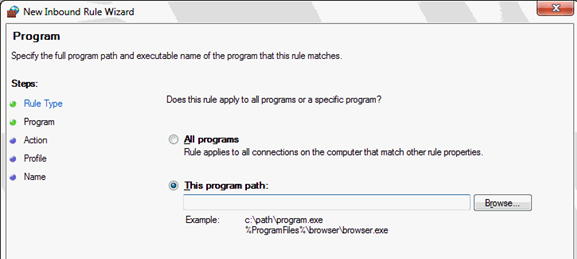 6. On the Program page, select This program path, then click Browse and navigate to the Application Server executable. The default path is: C:\Program Files\Ekran System\Ekran System\Server\EkranServer.exe. Then click Next.