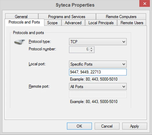 • In the Local port list, select Specific Ports, and then enter the following port numbers in the field below it: