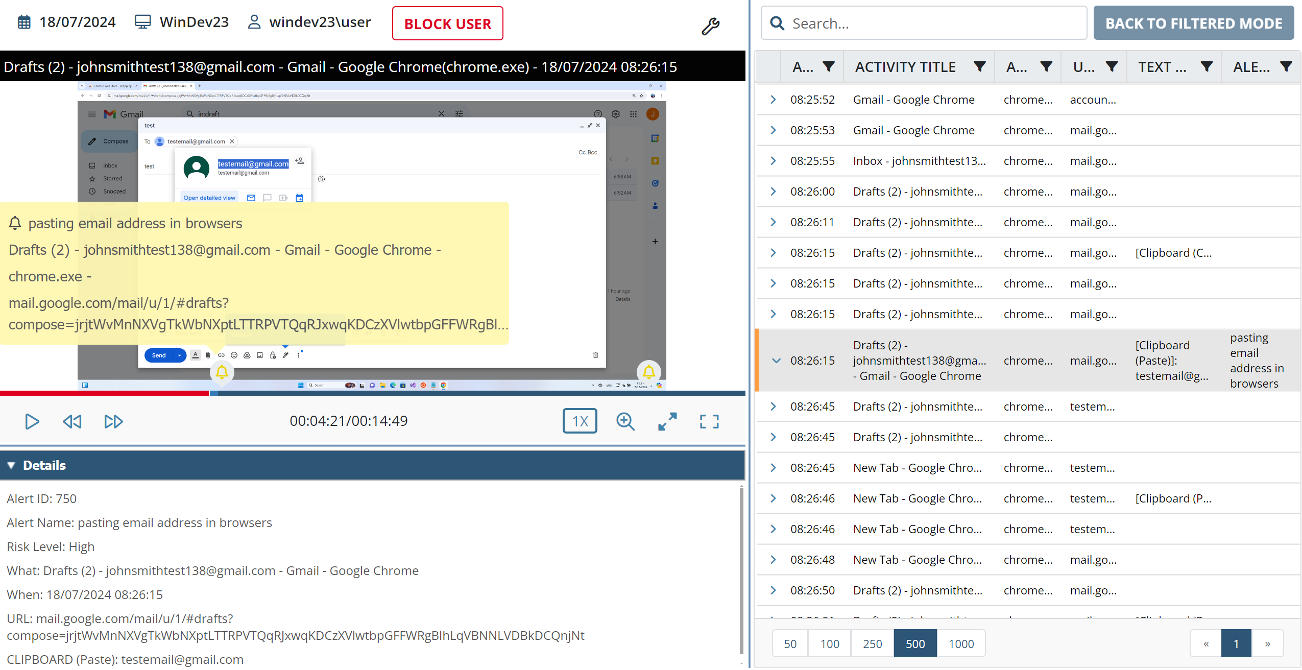 8. Then, whenever the alert is triggered, the corresponding alert event is displayed in the Session Player (shown for the alert rule example above).