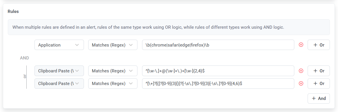 6. If required, add additional alert rules by clicking the “+ Or” and “+ And” buttons to work in combination with each other using OR/AND logic.