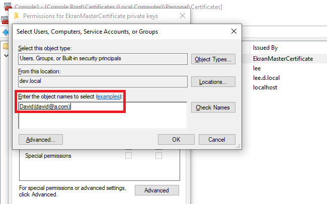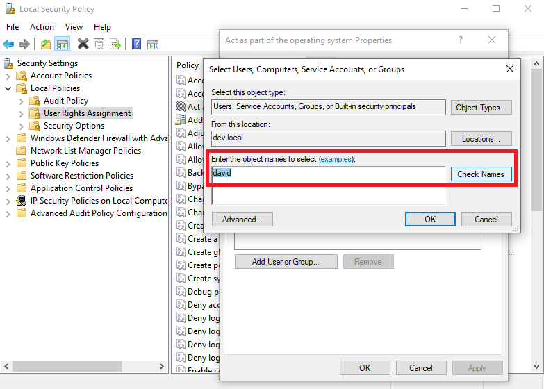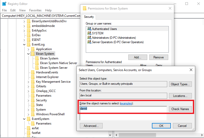 • In the Select Users, Computers, Service Accounts, or Groups pop-up window that opens, in the Enter the object names to select field, search for the required user (i.e. the non-admin user that you want to allow to start the EkranServer service) by entering the username (or part of the username), and then click the Check Names button, add the required user, and click OK in all the pop-up windows.