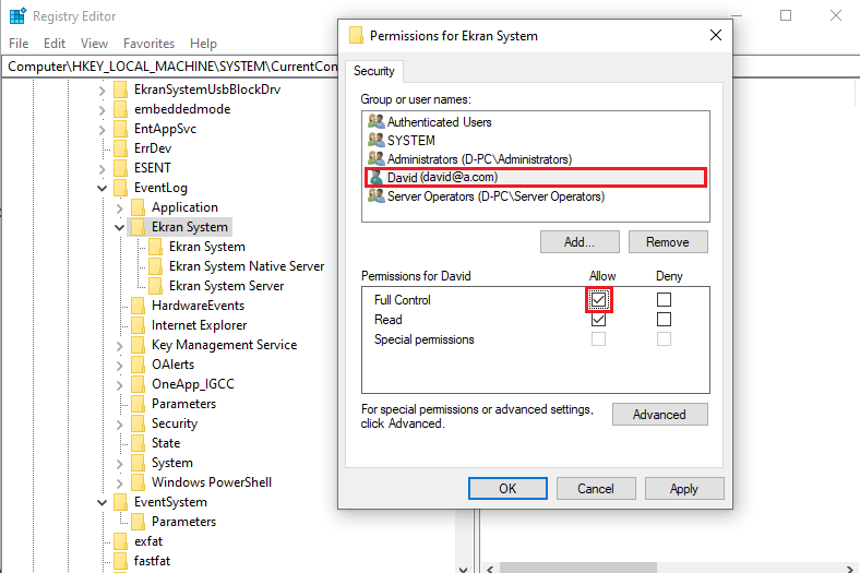 • To write to the registry: Allow the non-admin user the Full Control permission for the HKEY_LOCAL_MACHINE\SOFTWARE\EkranSystem registry key (in a similar way as above).