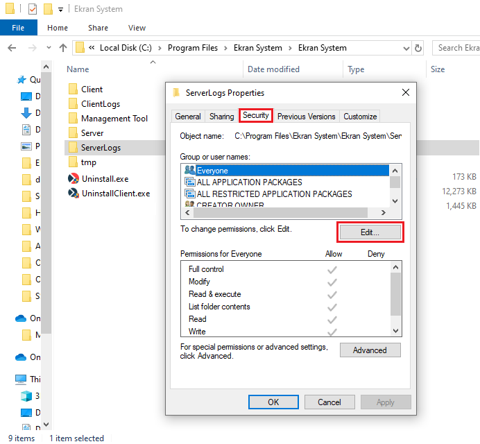 b) In a similar way as above (see 9a), to prevent certain errors related to file access: Allow the non-admin user the Full control permission for the C:\Program Files\Ekran System\Ekran System\Server directory.