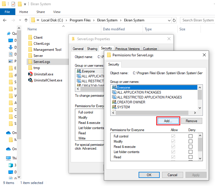 - In the Permissions for ServerLogs pop-up window that opens, click the Add button.