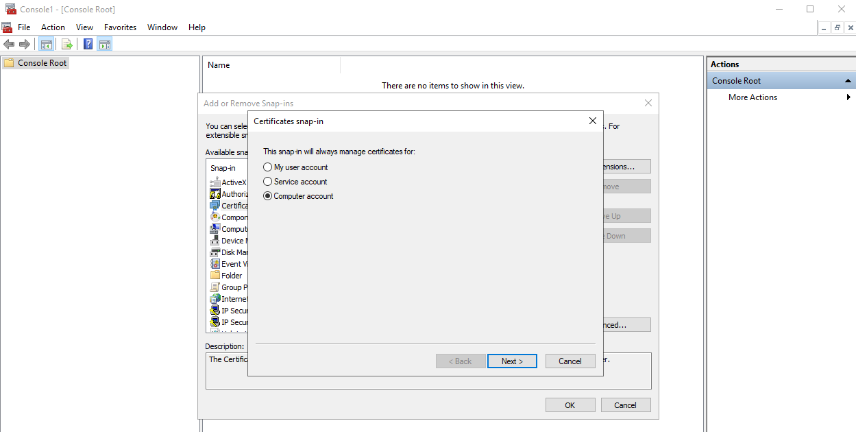 4. In the Certificates snap-in window that opens, select Computer account, and then click the Next button.