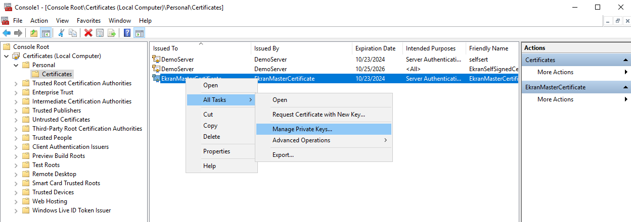10. Right-click on EkranMasterCertificate, and select All Tasks, and then select Manage Private Keys.