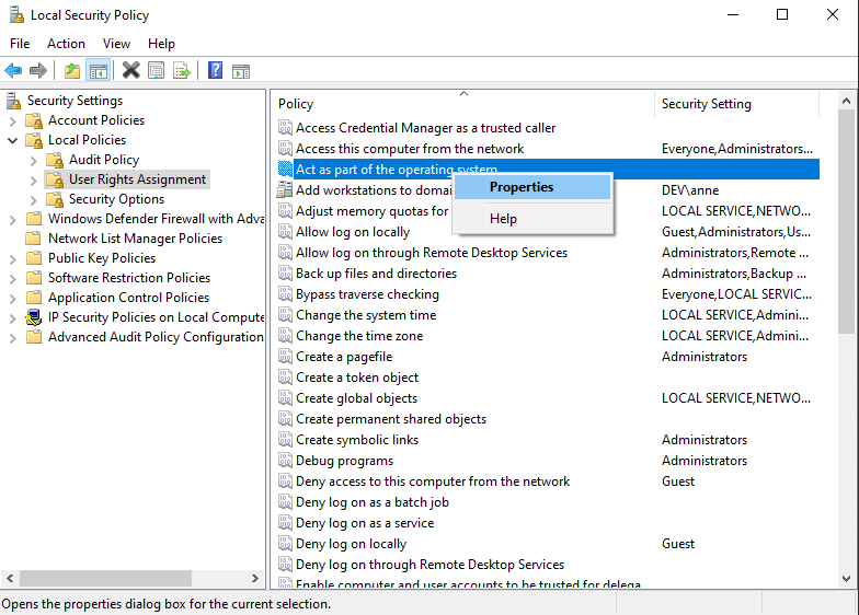 4. In the Security Settings folder, expand the Local Policies folder, and then click on the User Rights Assignment folder (see the screenshot below).