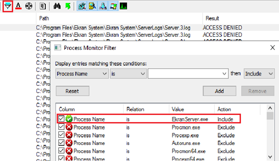 2. Open the Process Monitor Filter (e.g. by clicking on the Filter icon on the toolbar in the top left), and then specify the conditions "Process Name is EkranServer.exe", and click the Include > Add > OK buttons.