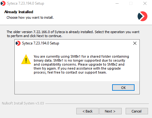 The error “You are currently using SMBv1 for a shared folder containing binary data. SMBv1 is no longer supported due to security and compatibility concerns. Please upgrade to SMBv2 and then try again. If you need assistance with the upgrade process, feel free to contact our support team.” in a popup message when using a shared folder containing binary data, while installing or updating to Syteca Application Server 7.23 (or higher).