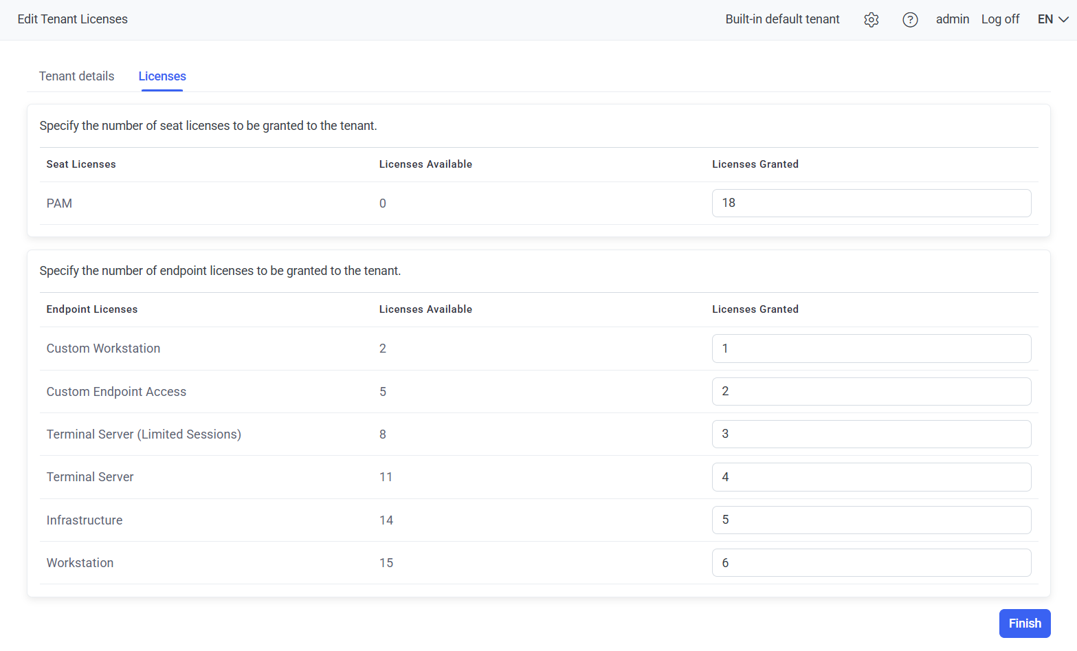 4. On the Edit Tenant page that opens, select the Licenses tab, and increase (if there are licenses available to do this in the Licenses Available column) or decrease the number of PAM seat licenses and/or the various types of endpoint licenses granted to the tenant in the Licenses Granted column as required by entering the required number of licenses of each type.