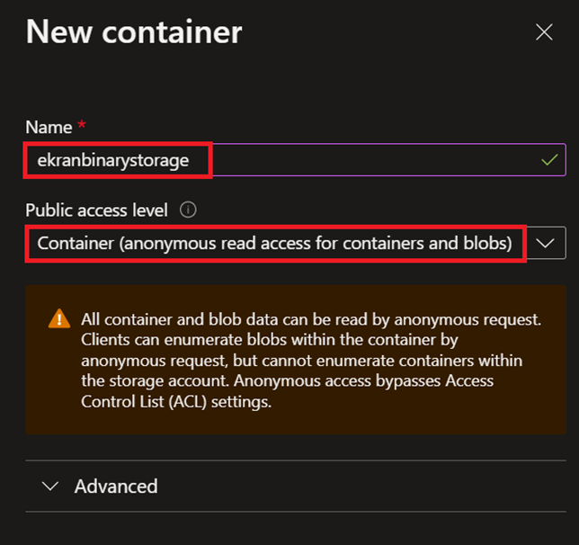 3. On the New container pane that opens, enter a name for the storage container, and in the Public access level drop-down menu, select Container (anonymous read access for containers and blobs).