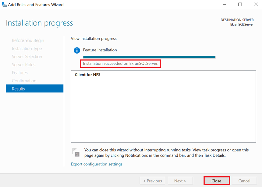 3. In the Add Roles and Features Wizard window that opens, select Features (on the left) to open the Select features page, and then select the Client for NFS feature, and click Next, and then confirm installation.