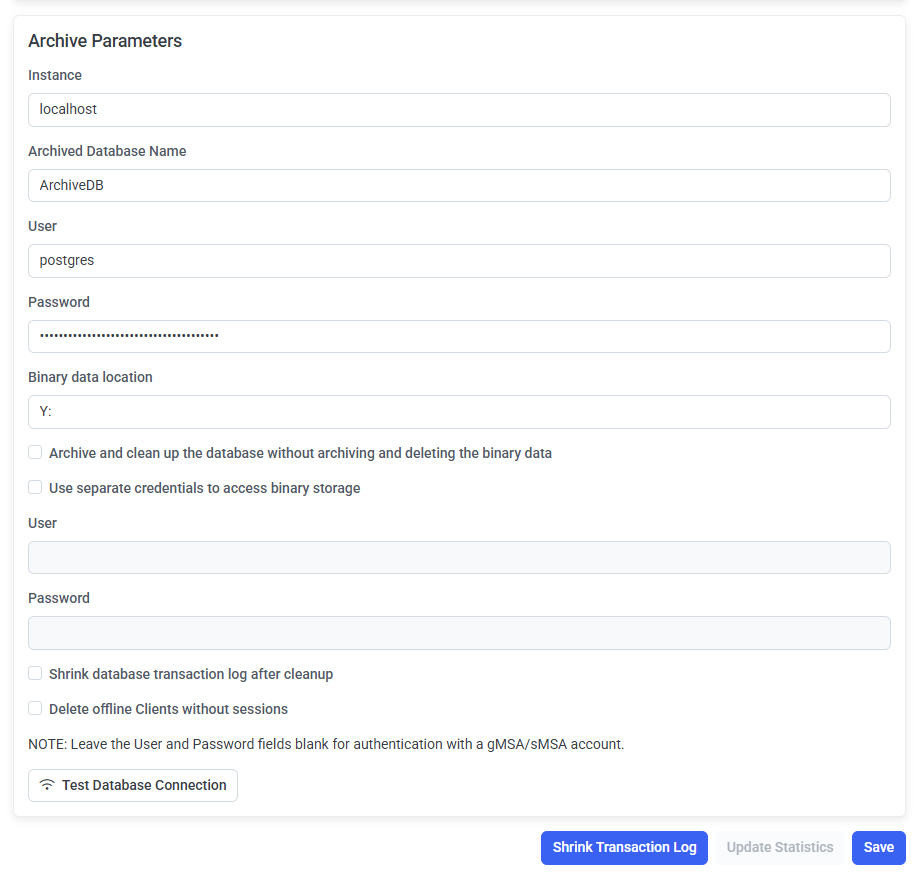 d) In the Archive Parameters section, enter the database server parameters, and the path to the connected storage location (container) to be used to store the archived data.