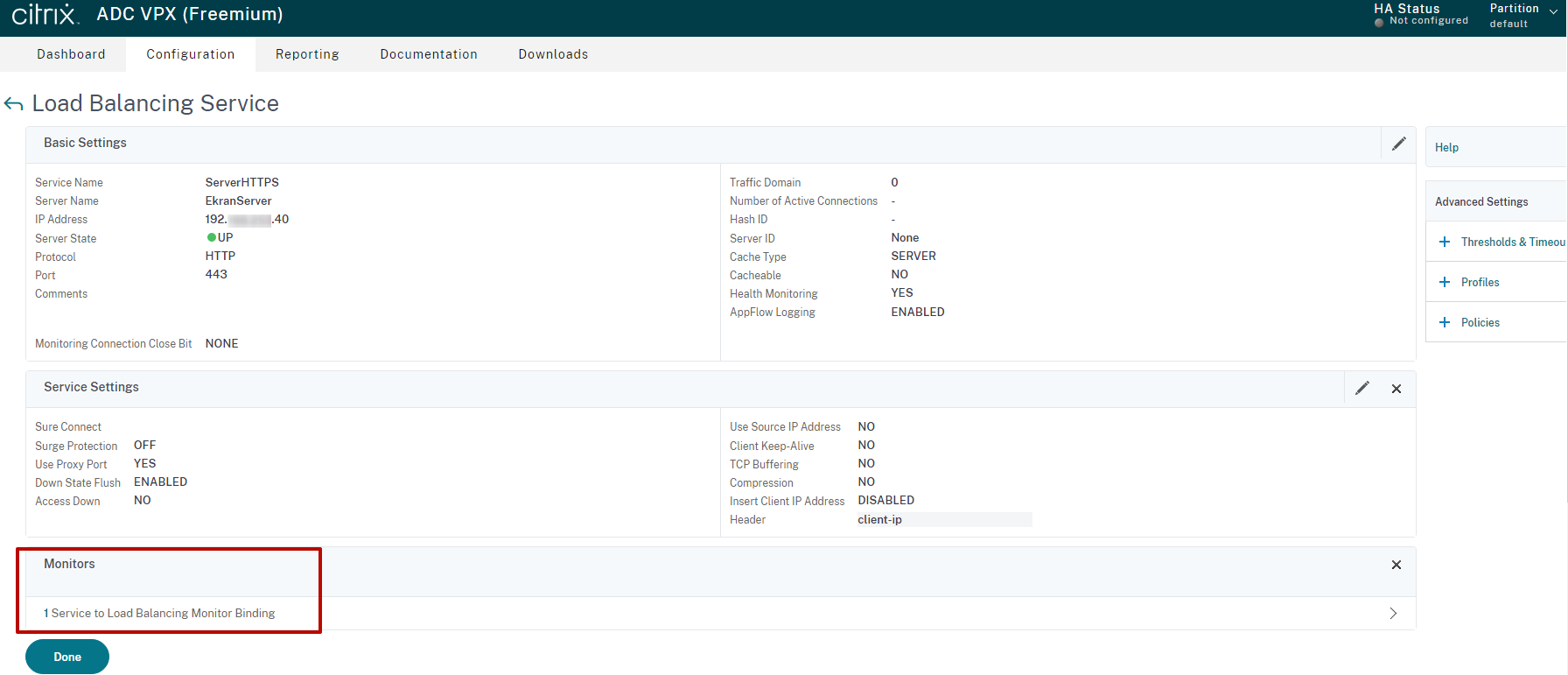1. In the Monitors section, click on No Service to Load Balancing Monitor Binding.