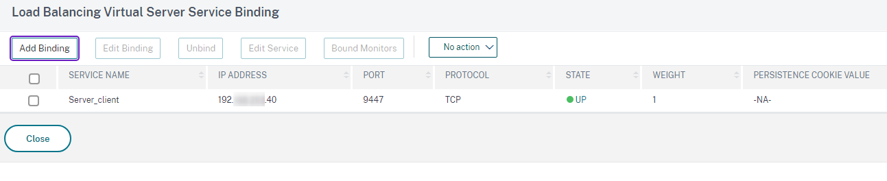 • The service with the TCP protocol and port 9447 needs to be bound to the Virtual Server with the same port and protocol.