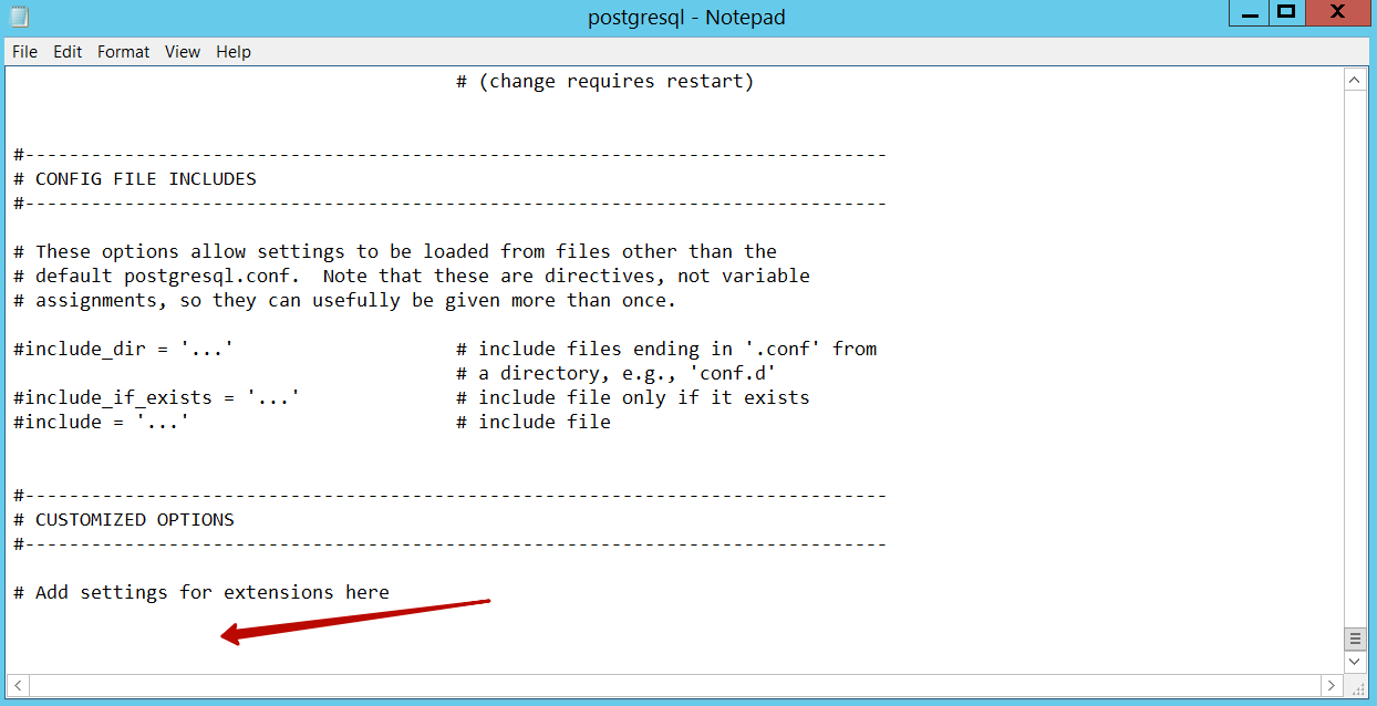 4. On the machine with the PostgreSQL database installed, in the C:\Program Files\PostgreSQL\13\data folder, open the postgresql.config file, and paste the script that you copied to add it to the bottom of the file.