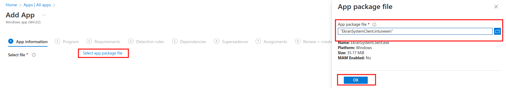 4. Click on Select app package file, and then select the SytecaClient.intunewin file, and click OK.