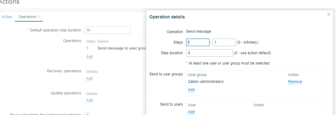 4. Then configure an Operation, with the Users and/or User groups to be sent notifications (in this case shown in the screenshot below, all users who belong to the Zabbix Administrators user group will receive notifications).
