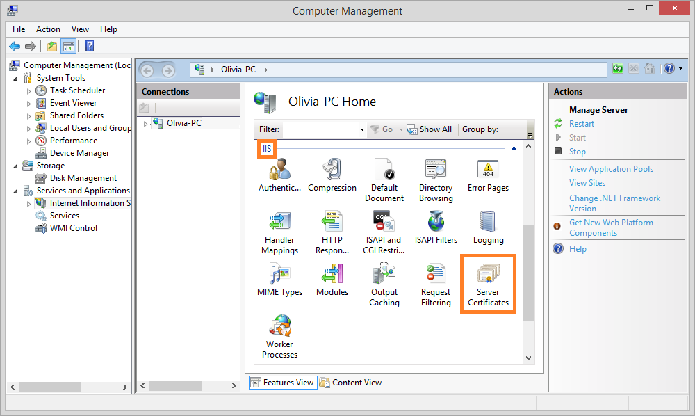 2. Click the main node in the Connections tree-view, and then double-click the Server Certificates icon in the IIS section.