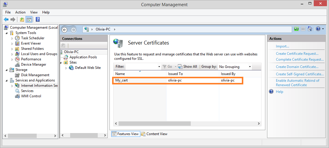 4. In the Actions pane on the right, click Create Self-Signed Certificate.