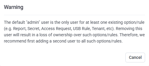 NOTE: The default admin user cannot be disabled (i.e. the Confirm button is not displayed) if the default admin user is the only user having ownership of any existing options/rules (i.e. Reports, Secrets, Access Requests, and USB Rules) added in the Management Tool. Therefore, at least one other user must first be added to all such existing options/rules (or these options/rules can instead be deleted). For more details, see section 2. Requirements for Disabling the Default Admin User below.