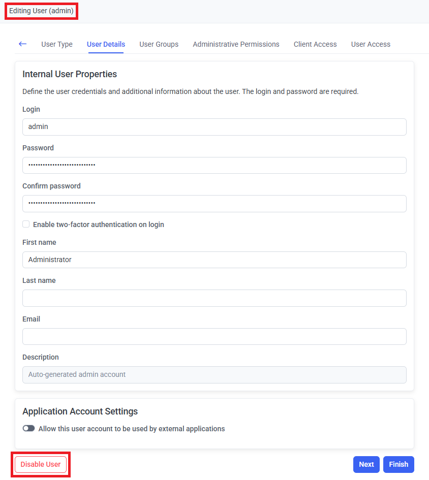 NOTE: The Disable User button (which is only available when editing the default admin user) is only displayed if at least one internal user or Active Directory user / user group has been added to the default Administrators user group.