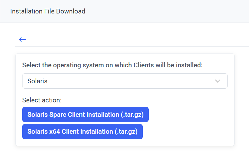 - Solaris Sparc Client Installation (.tar.gz): To generate an installation package while defining the Solaris Sparc Client configuration parameters to be used for installing it (see Point 6 below).
