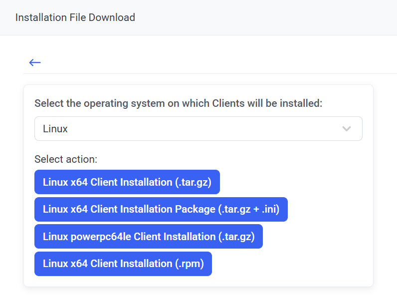 - Linux x64 Client Installation Package (.tar.gz+.ini): To generate a standard installation package (which also supports SELinux) while defining the Linux Client configuration parameters to be used for installing it (see Point 6 below).