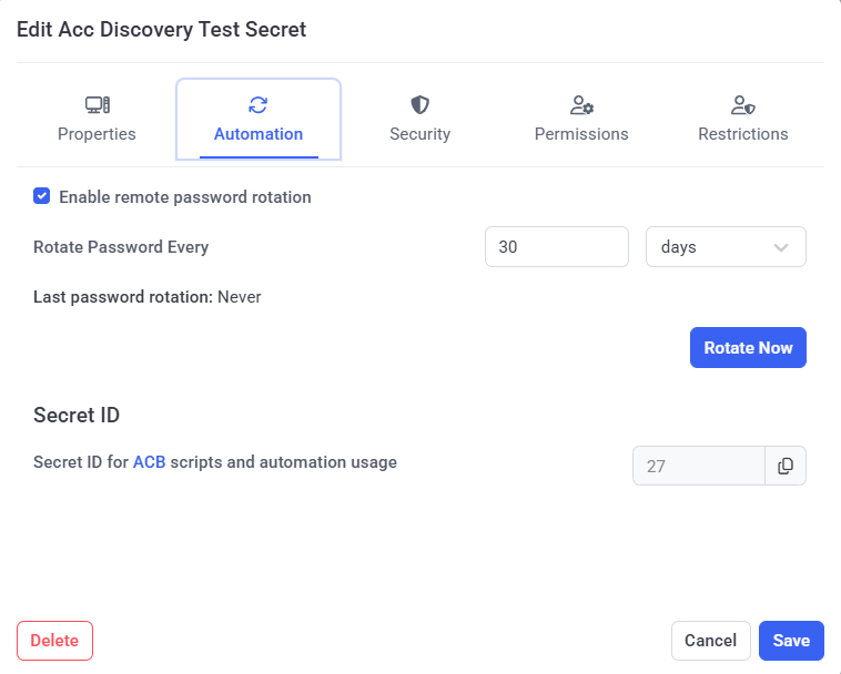 - Rotate Now (button): If the Enable remote password rotation checkbox is selected and remote password (or SSH key) rotation is configured, this button can be clicked at any time to manually rotate the account's password (or SSH key) immediately.