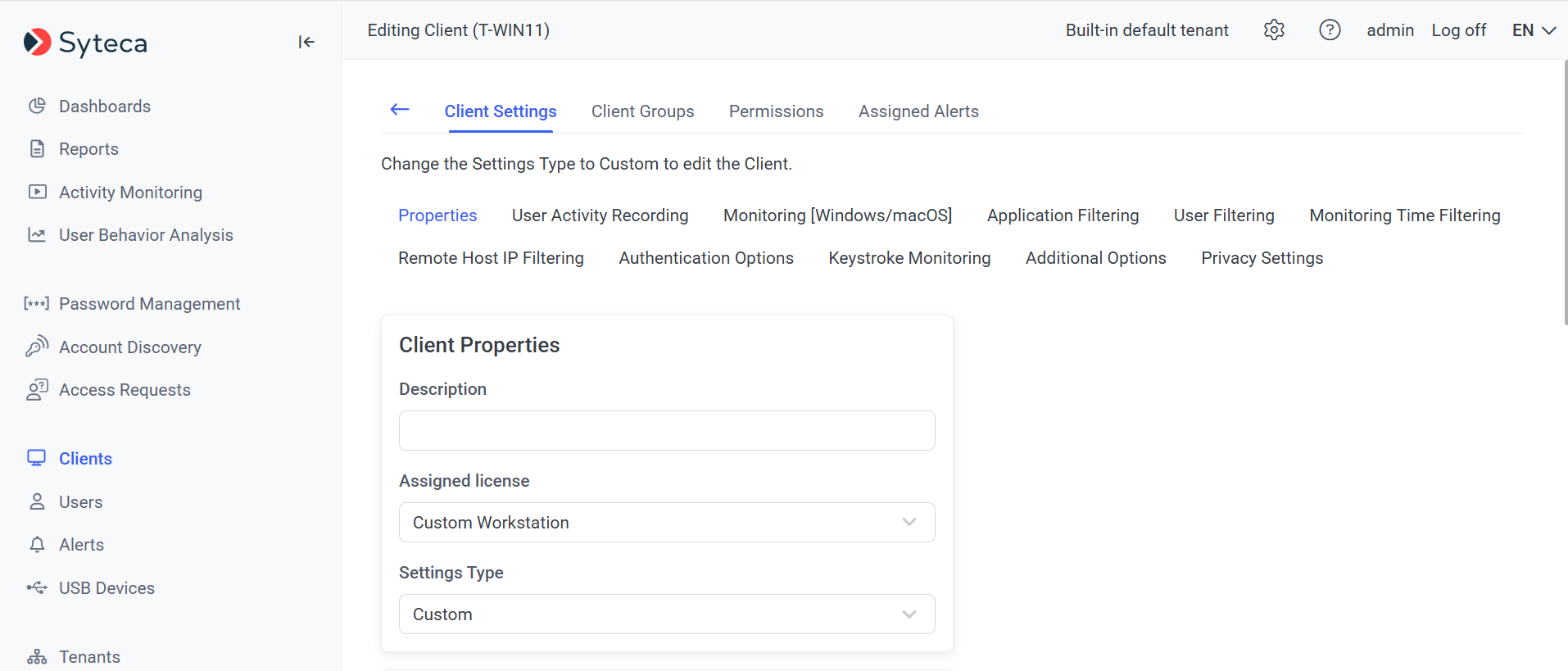 - Select Custom to be able to edit all the Client settings.