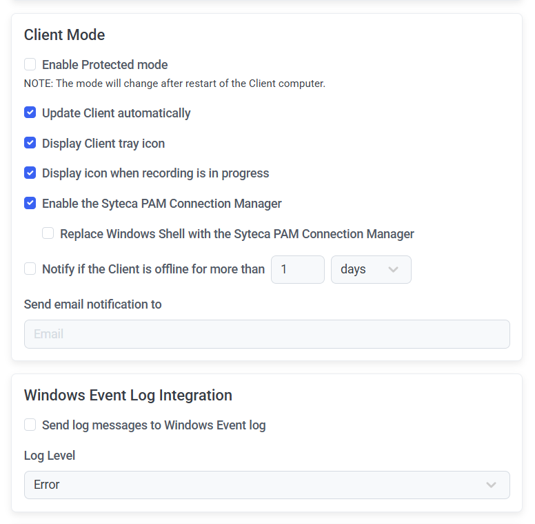 - Select the Send log messages to Windows Event log checkbox and select the severity level (Error, Warning, or Information) of the log entries in the Log Level drop-down list if you want to save Syteca events, such as errors, warnings, and informational messages to the Windows Event log on the Client Computer.
