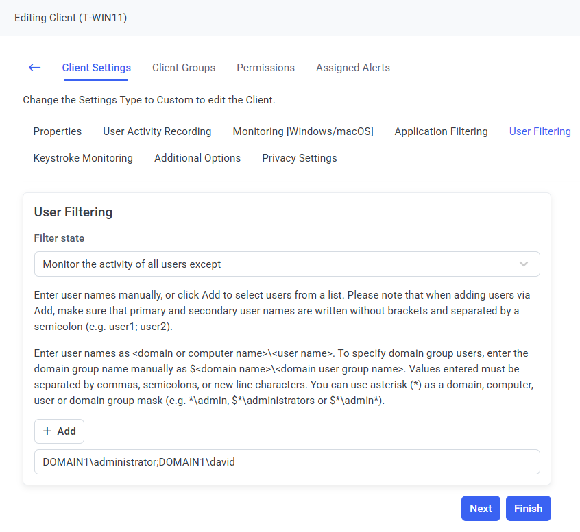 8. On the User Filtering tab, define the User Filtering parameter for the Client.
